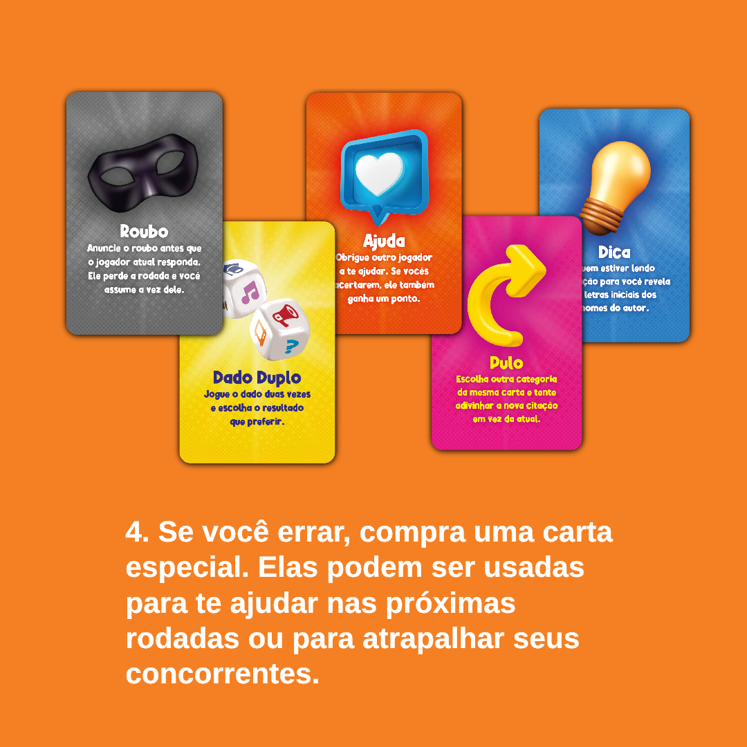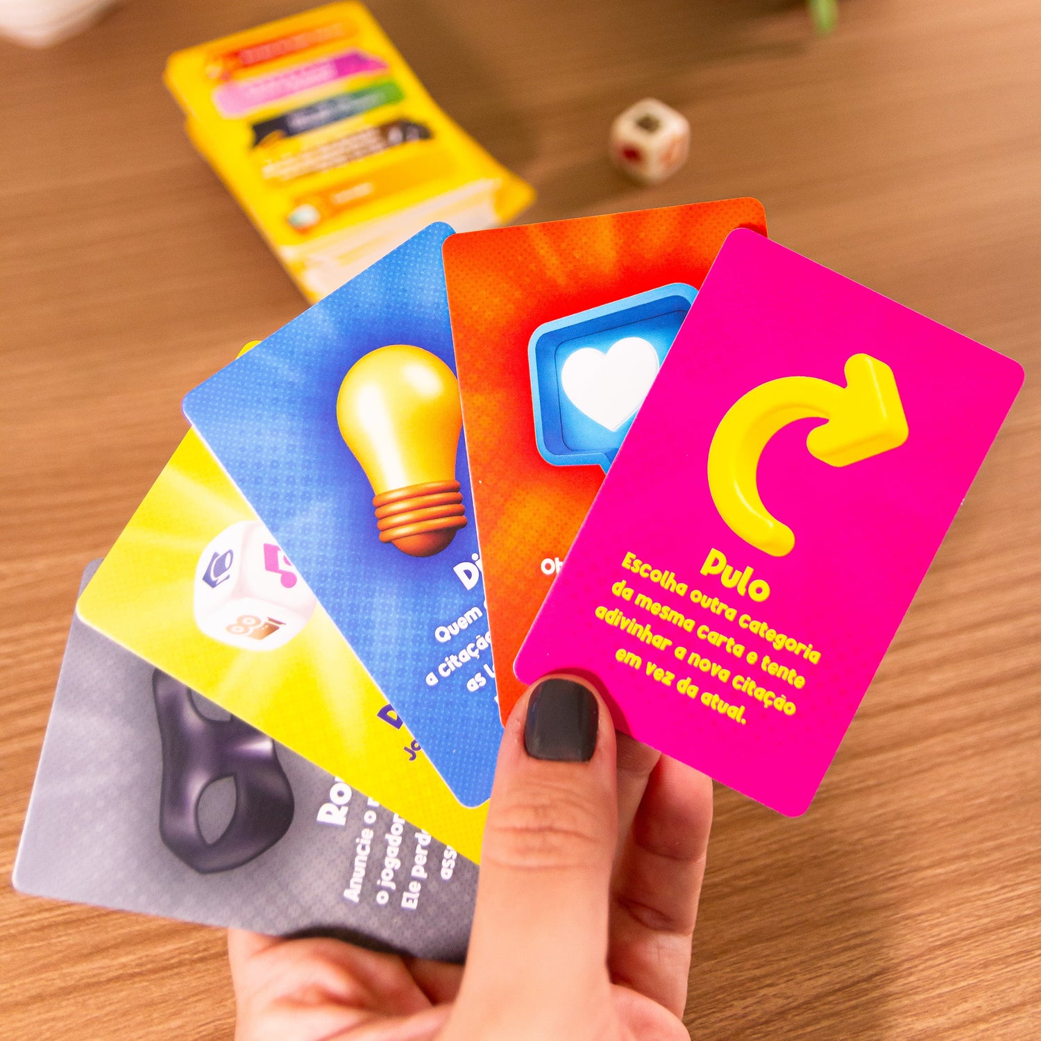 Quem erra a resposta pega uma carta especial para causar com todo mundo. Tem carta para chamar ajuda de um amigo (mesmo que ele não queira!) e tem até carta para roubar a resposta do outro!